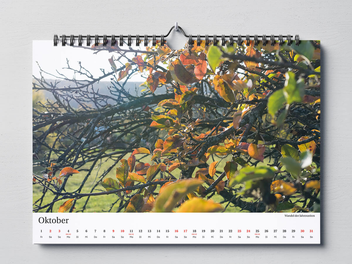 Den 13-seitigen Wandkalender im Format DinA3 (inkl. Deckblatt) habe ich mithilfe eines InDesign-Skripts namens „Calendar Wizard“ erzeugt. Das Skript erzeugt automatisiert ein Kalendarium. Es bietet zudem viele nützliche Optionen und Einstellmöglichkeiten. Es ist außerdem nach der Generierung nahtlos mit InDesign verzahnt und z. B. über die Formatoptionen anpassbar.