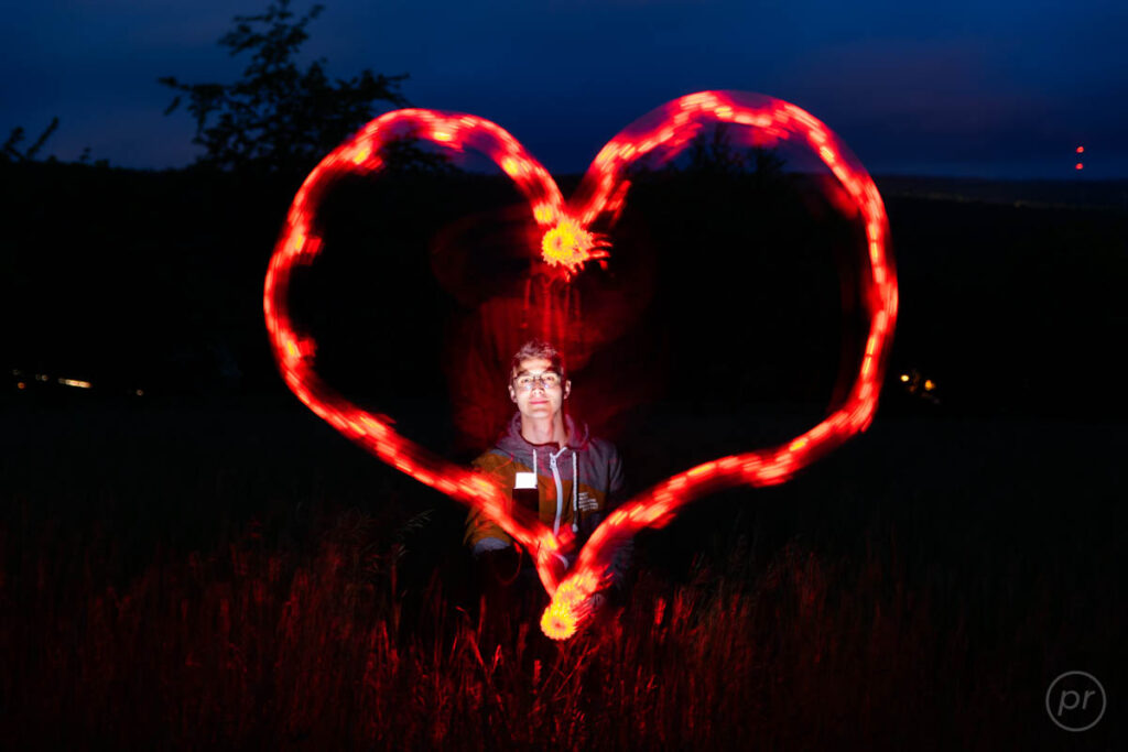 Zum Auftakt haben wir eine KFZ-Sicherheitsleuchte umfunktioniert. Diese bietet zahlreiche Lichteffekte, u. a. auch ein orangenes Dauerlicht. Damit hat Luca ein Herz gezeichnet. Mit dem Blitz hat er aus der Hand einen Beleuchtungsakzent gesetzt. Während er umgreifen musste, habe ich das Objektiv abgedeckt.