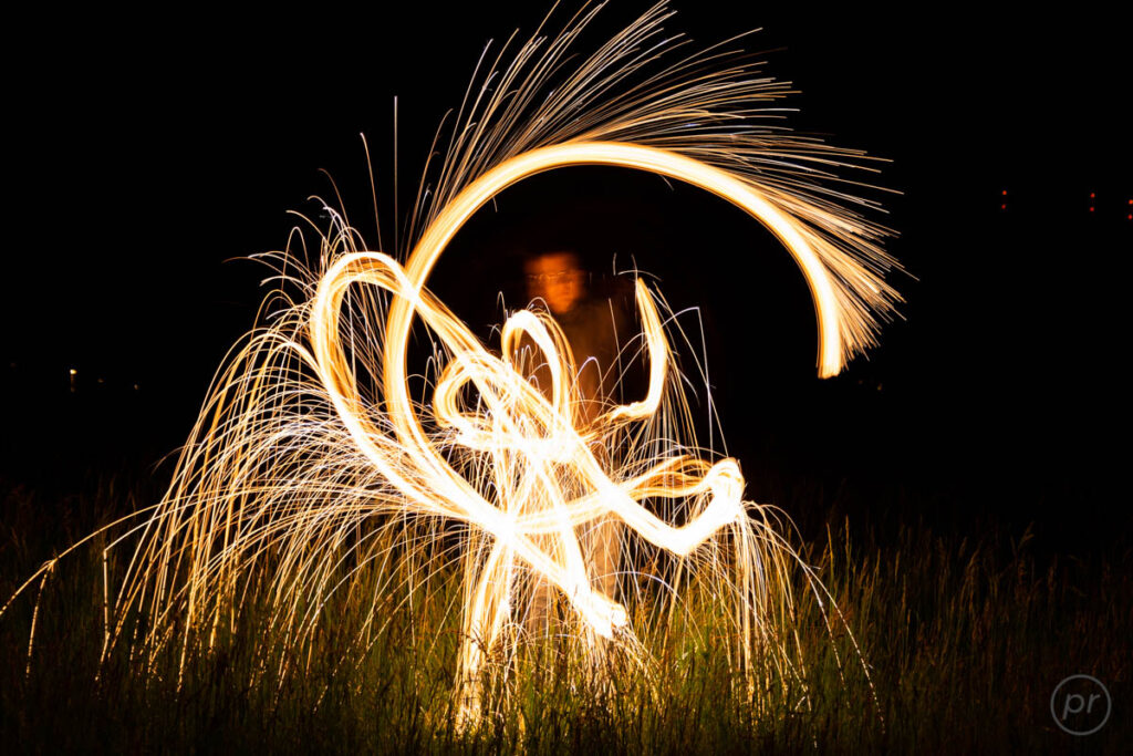 Stahlwolle ist eine tolle Möglichkeit, spektakuläre Effekte zu erzielen. Wir haben eine Wolle vom Typ 000 verwendet. Wir haben ein ca. 10 cm langes Stück an ein Ende eines ca. 50 cm langen Drahts befestigt. Ich habe mich damit in Position gestellt. Nachdem von Luca das OK kam, habe ich den Draht mit der Stahlwolle im Kreis geschwungen. Bei der Stahlwolle haben wir über mehrere Runden experimentiert mit der Belichtungszeit. Luca hat den Aufsteckblitz außerdem gegen Ende einer Aufnahme ausgelöst, um mich aufzuhellen