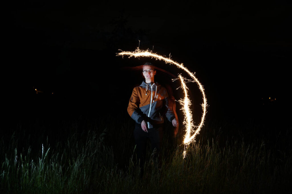Zum Abschluss haben wir noch ein Shooting mit Wunderkerzen gemacht. Dazu hat sich Luca in Position gebracht und mit den Wunderkerzen etwas in die Luft gezeichnet. Ich habe mit dem Aufsteckblitz Aufhellblitze erzeugt.