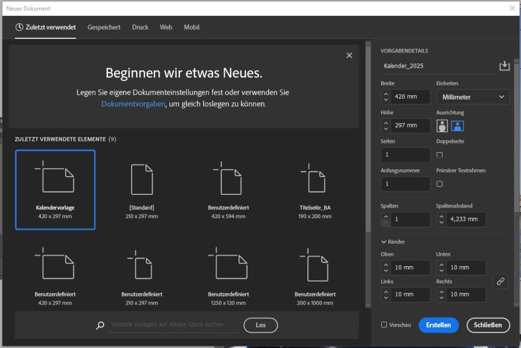 Ich erstelle zuerst ein neues InDesign-Dokument (auf Basis einer Vorlage), welches Ränder und Anschnitt definiert.