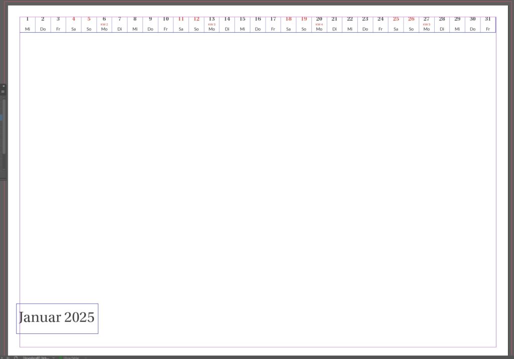 - Vor den Kalenderwochen will ich das Präfix „KW“ in meinem Kalendarium haben. Um auch ein Leerzeichen zu haben, z. B. „KW 01“ muss ich dieses vor Generierung des Kalendariums jedesmal einfügen.